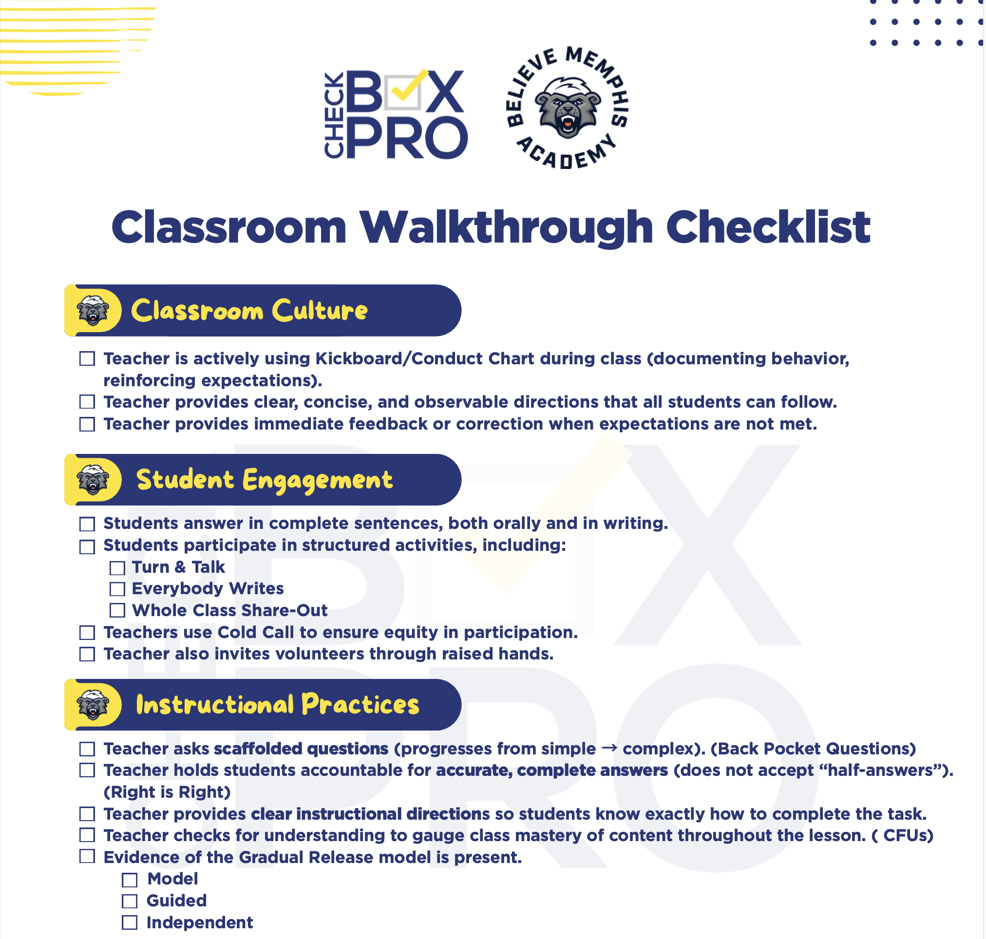 This Classroom Walkthrough Template, shared with us by Matthew Cowan, Executive Director of Believe Memphis Academy, is a ready-to-use tool that guides your observations and keeps the focus on what matters most for student learning.
